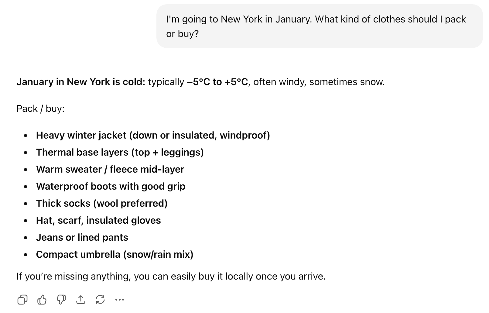 Behind that single question, the AI runs multiple parallel processes: checking New York weather patterns for January (average highs around 40F, lows in the high 20s, significant wind chill), identifying typical activities (walking, subway, indoor venues), determining relevant clothing categories (outerwear, layers, footwear, accessories), and synthesizing practical recommendations from travel guides, fashion content, and cold-weather expertise.