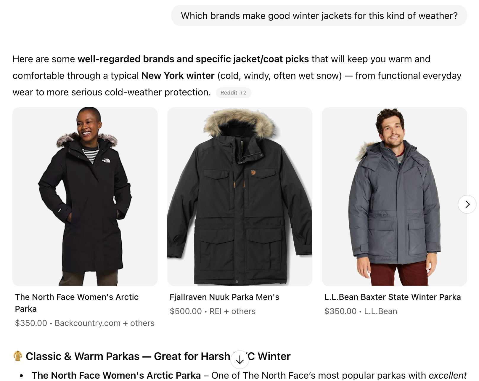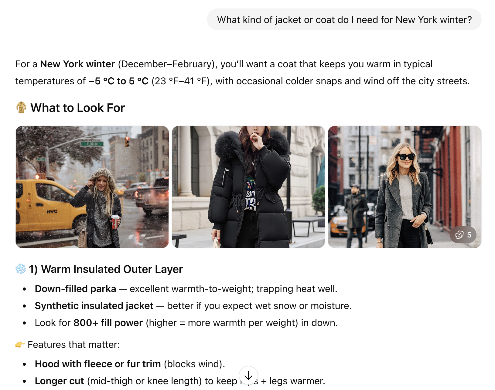 In traditional search, this person would need to already know enough to construct a useful query. They'd search "winter clothes New York" or "what to wear January NYC" and get back a mix of packing lists, fashion blogs, and retail landing pages. The quality of results depended heavily on how well they guessed the right keywords.