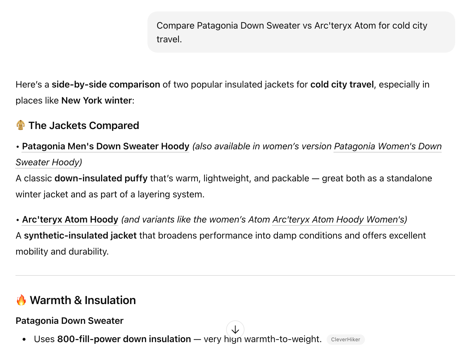 The response might compare warmth-to-weight ratio, packability, durability track record, style versatility, and price. It translates technical differences into practical implications: "The Down Sweater provides slightly better warmth for weight, while the Atom offers superior breathability and moisture management if you'll be active."