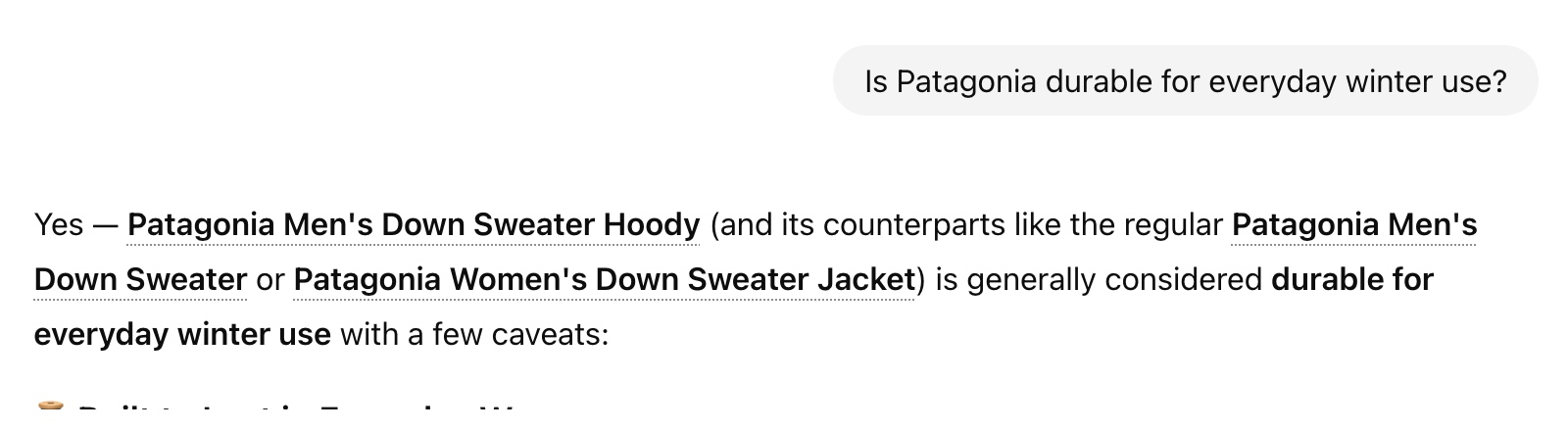 Consider what happened in our example. A user went from "what should I pack for New York" to "I want to buy a Patagonia Down Sweater" through six prompts in a single conversation. That entire decision-making process which might have previously generated dozens of measurable touchpoints across multiple properties, happened in a closed system that produces no measurable signal until the user clicks out.